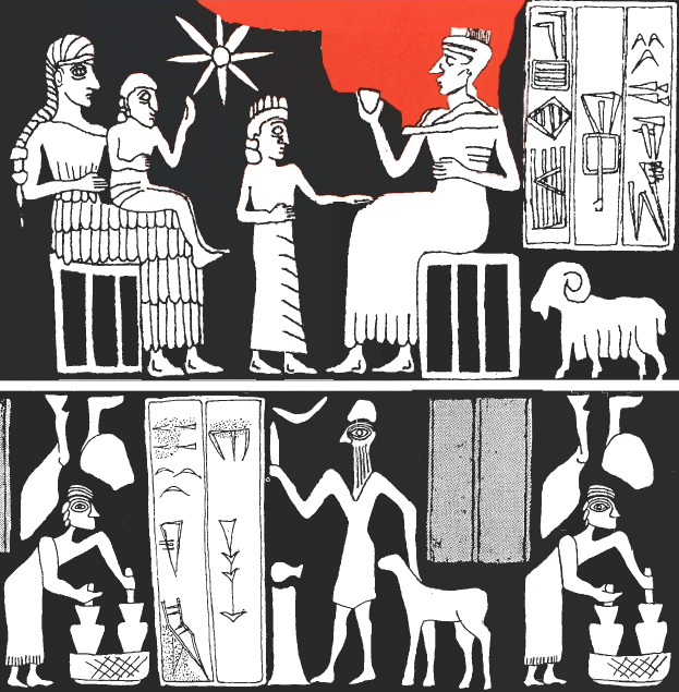 Episode Image: Composite drawing of a Hurrian royal seal impression showing the endan Tupkish with the crown prince touching his lap and Queen Uqnitum holding her daughter on her lap. From Giorgio Buccellati and Marilyn Kelly-Buccellati, In Search of Hurrian Urkesh: City of Myth, Odyssey, May/June 2021.